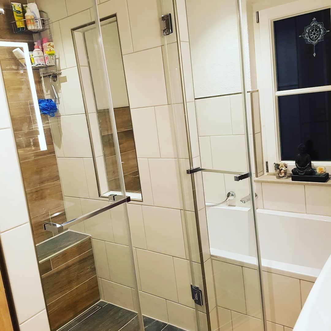 Duschverglasung bestehend aus zwei Pendel-Türen mit integrierten Handtuchhaltern.